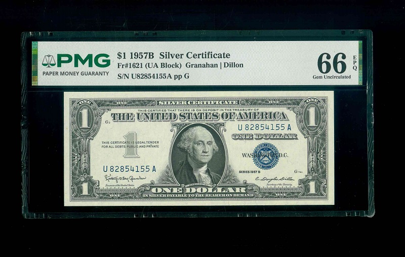 1957B 美國$1 PMG 66 EPQ 編號: U82854155A(頂級雪白)