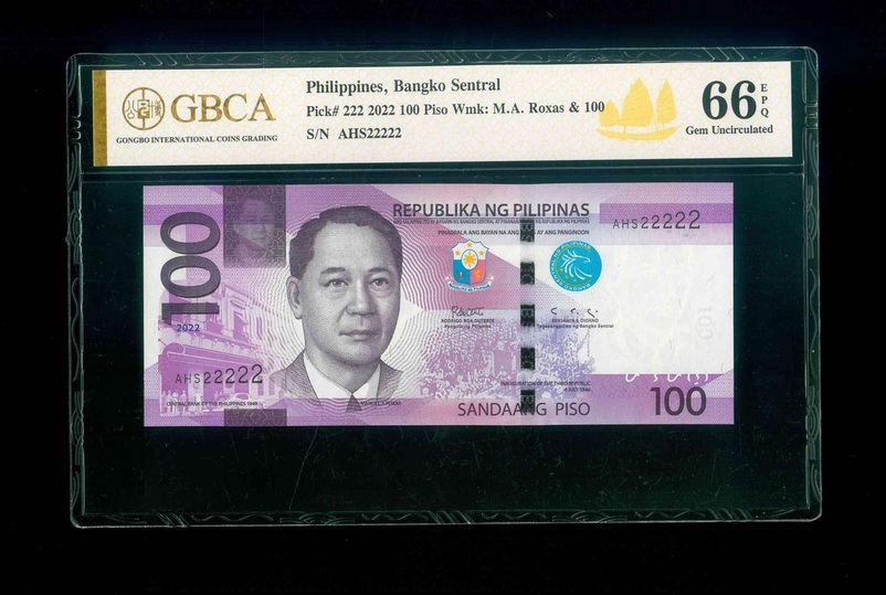 2022 菲律賓 100 Piso GBCA 66 EPQ 編號: AHS22222(全2,頂級雪白)