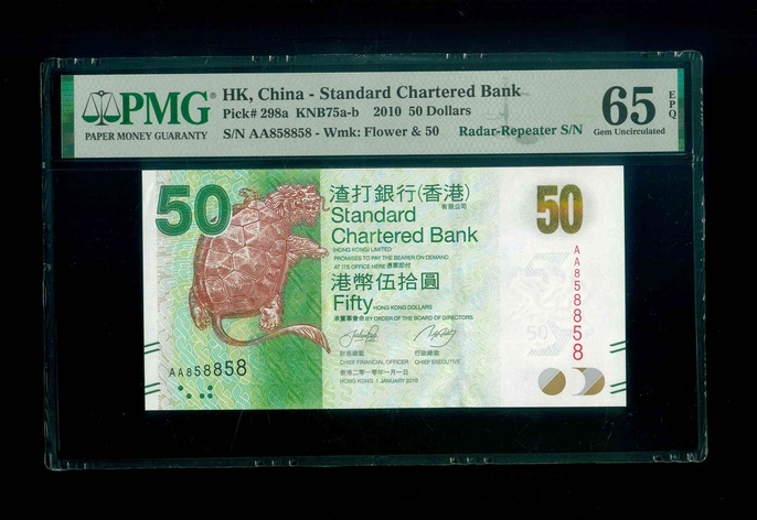 2010 香港渣打銀行$50 PMG 65 EPQ 編號: AA858858(頭版雷達重覆號,頂級雪白)