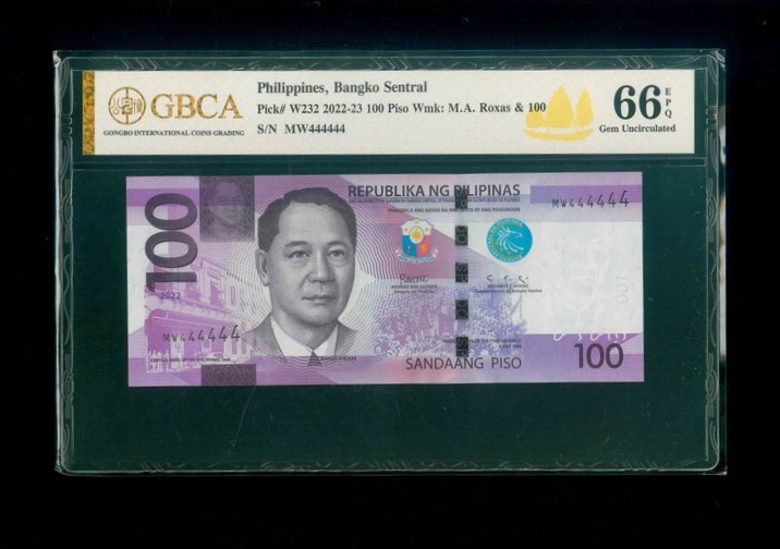 2022 菲律賓100 Piso GBCA 66 EPQ 編號: MW444444(全4,頂級雪白)