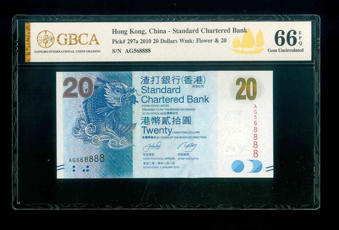 2010 香港渣打銀行 $20 GBCA 66 EPQ 編號:AG568888(獅子號,頂級雪白)