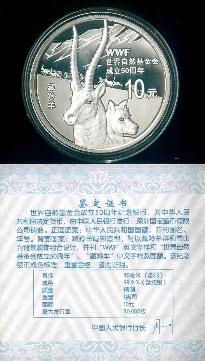 2008 中國(WWF 成立50周年-藏羚羊) $10 (1oz Asw) Proof 編號:NIL(盒連証書)