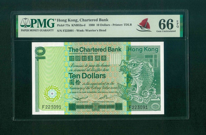 1980 香港渣打銀行$10 PMG 66 EPQ 編號: F223091(紙膽系列,頂級雪白)