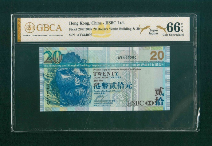 2009 香港上海滙豐銀行 $20 GBCA 66 EPQ 編號: AV444000(雙豹號,頂級雪白)
