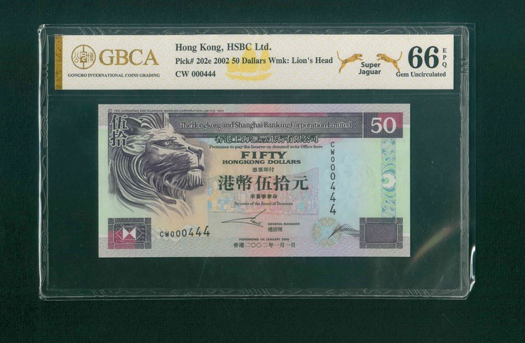 2002 香港上海滙豐銀行 $50 GBCA 66 EPQ 編號: CW000444(雙豹號,頂級雪白)