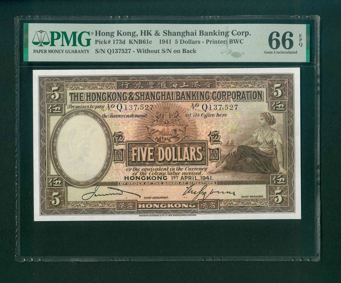 1941 香港渣打銀行 $5 PMG 66 EPQ 編號: Q137527(頂級雪白)
