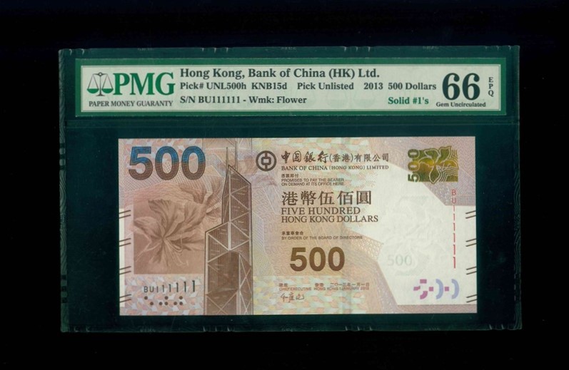 2013 香港中國銀行$500 PMG 66 EPQ 編號: BU111111(幸運全1,頂級雪白)