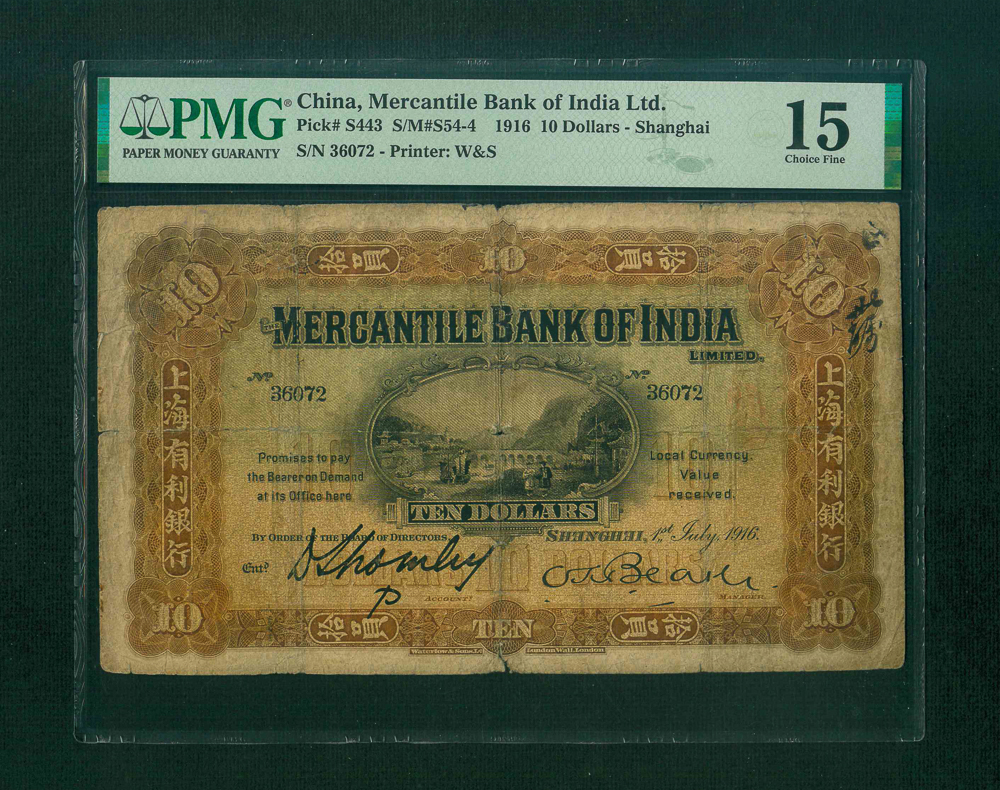 1916 上海有利銀行$10 PMG 15 編號: 36072, 有開裂及印章, 外商紙系列