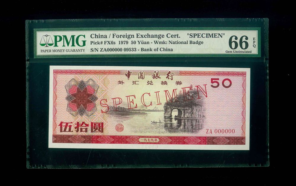 1979 中國銀行-外匯兌換券$50 PMG 66 EPQ 編號: ZA000000, 樣鈔