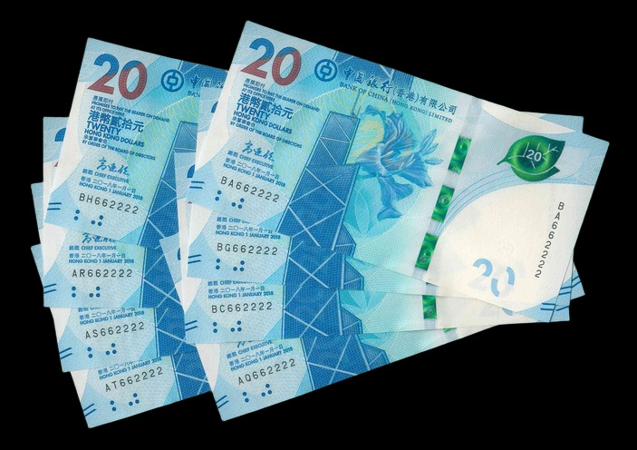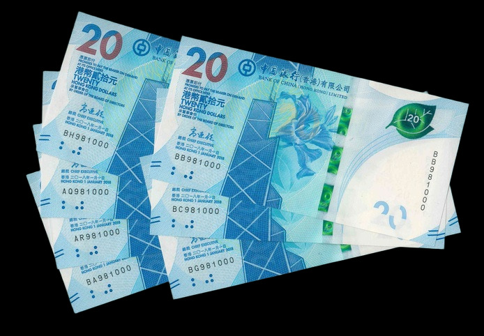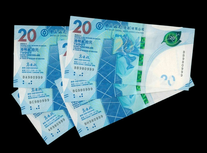 2018 香港中國銀行 $20 UNC 編號: BB980999...(共6張,豹子同號,頂級雪白)