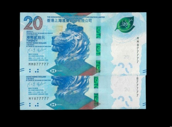 2023 香港上海滙豐銀行 $20 UNC 編號: MY/MM8777777(共2張,老虎同號,頂級雪白)