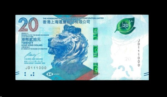 2020 香港上海滙豐銀行 $20 UNC 編號: JD111000(雙豹二進制,頂級雪白)