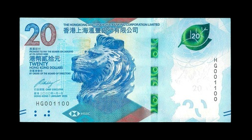 2020 香港上海滙豐銀行 $20 UNC 編號: HG001100(二進制三對子,頂級雪白)
