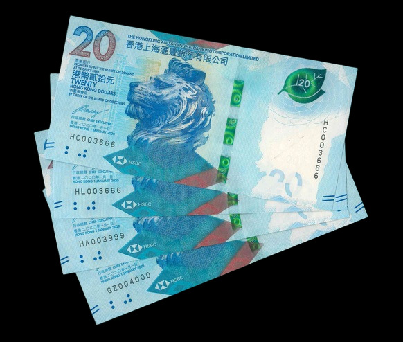 2020 香港上海滙豐銀行 $20 UNC 編號: HC003666...(共4張,豹子,含同號,頂級雪白)
