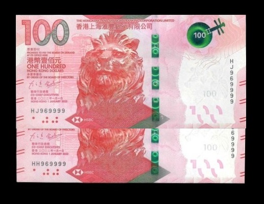 2022 香港上海滙豐銀行 $100 UNC 編號: HH/HJ969999(共2張,獅子同號,頂級雪白)