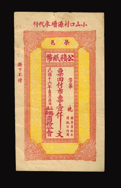 1927 民國16年台灣榮邑公積紙幣 壹仟文 EF 編號:NIL