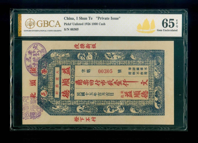 1926 台灣榮邑益順德 壹仟文 GBCA 65 EPQ 編號:00305(Private Issue)