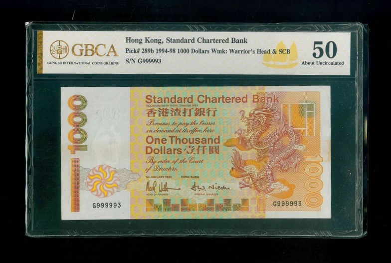 1994 香港渣打銀行 $1000 GBCA 50 編號:G999993