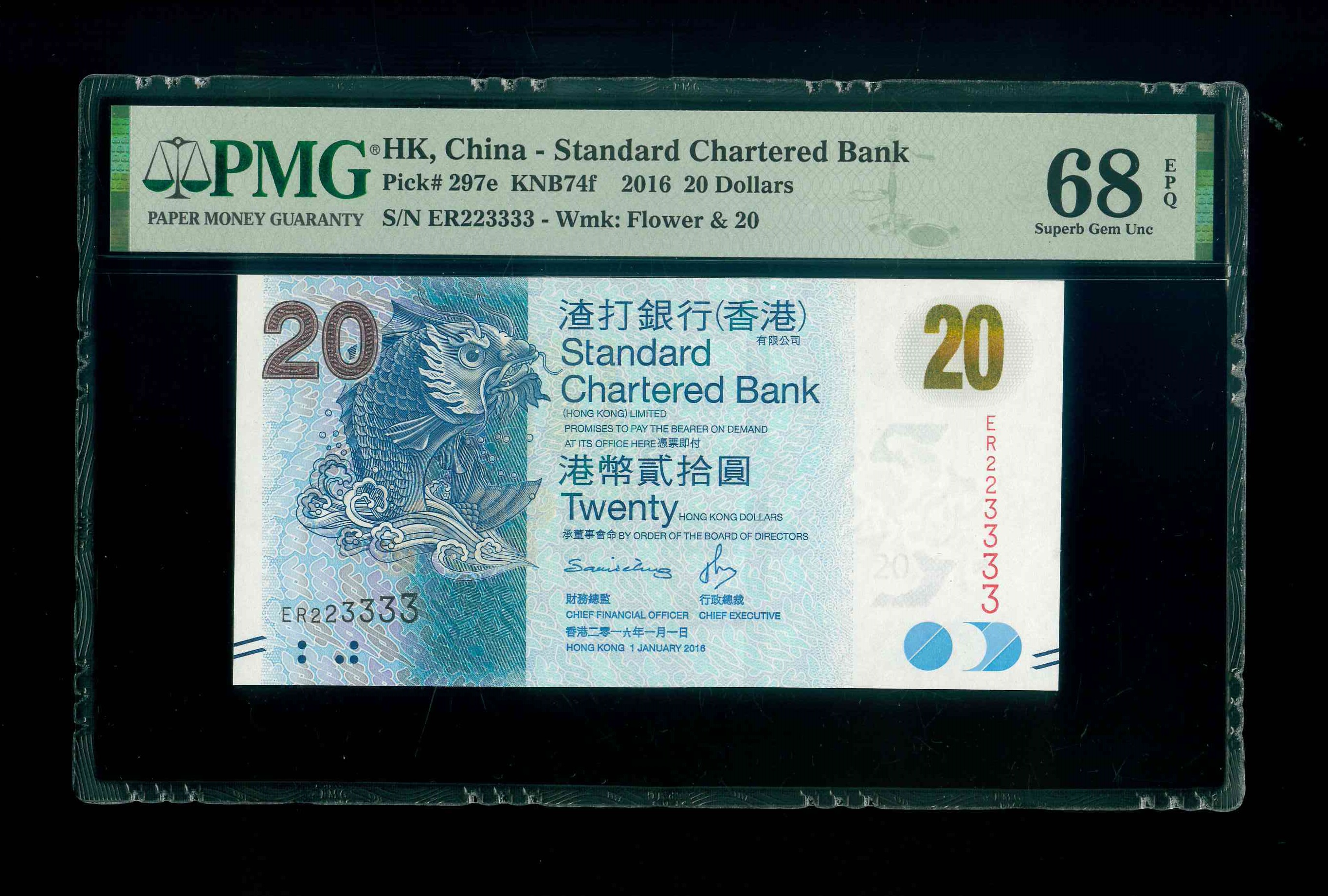 2016 香港渣打銀行 $20 PMG 68 EPQ 編號:ER223333(獅子三對子,頂級雪白)