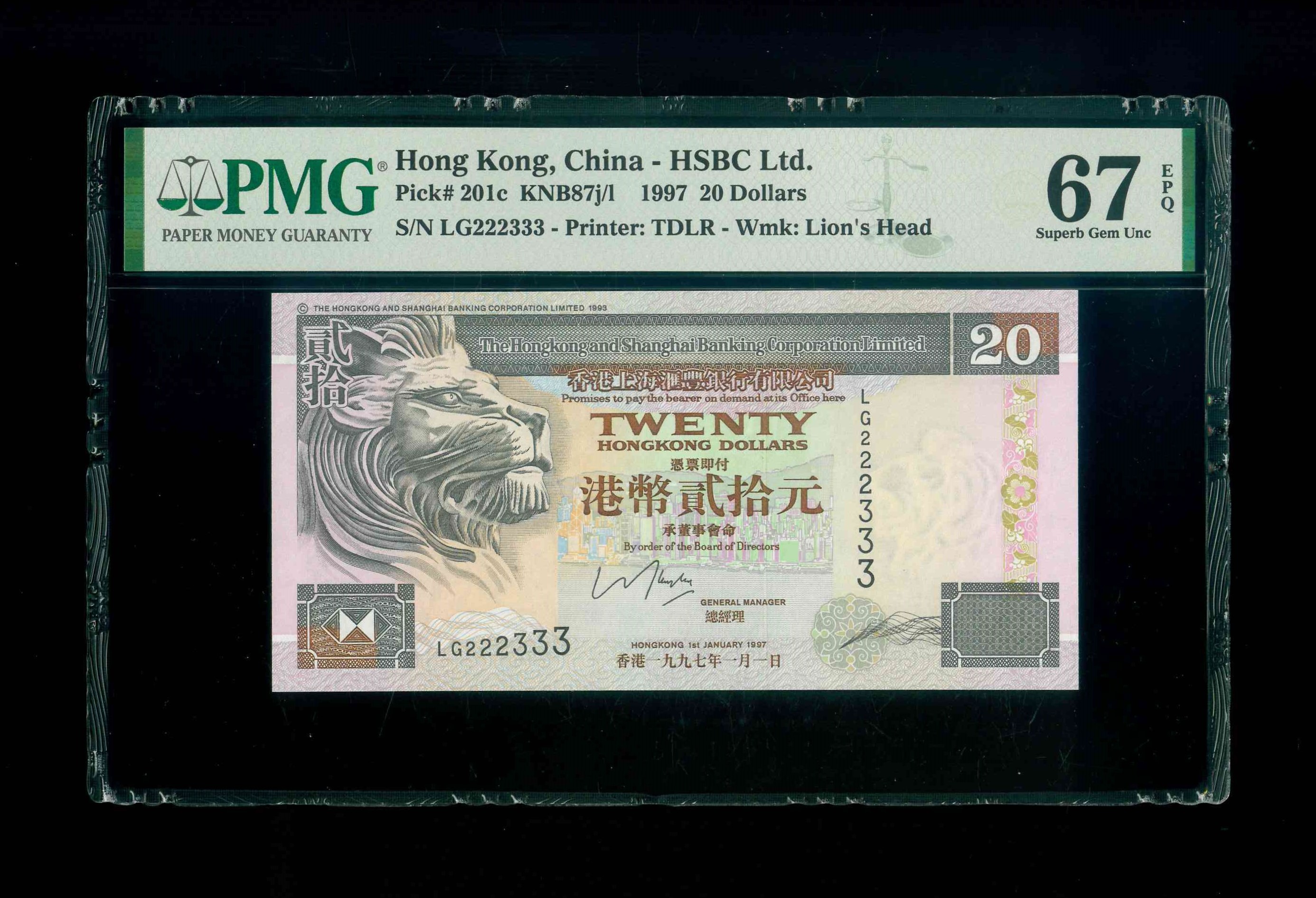 1997 香港上海滙豐銀行 $20 PMG 67 EPQ 編號:LG223333(獅子三對子,頂級雪白)