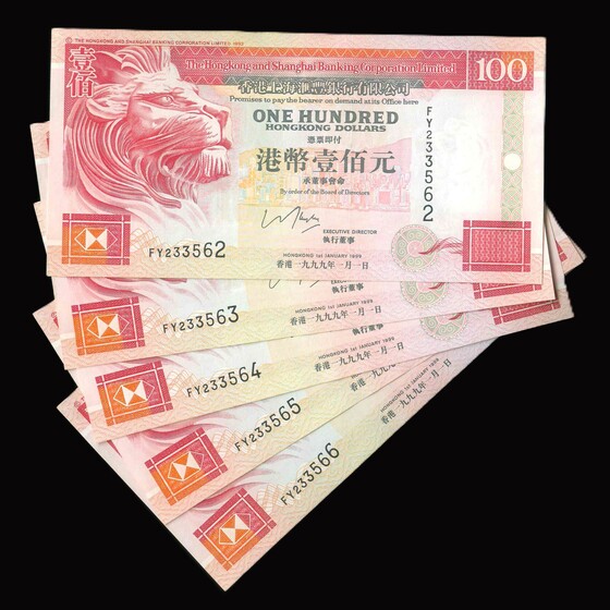 1999 香港上海滙豐銀行 $100 UNC 編號:FY233562-566(共5張,連號,頂級雪白)