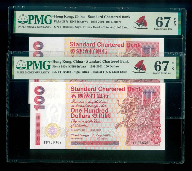 1999 香港渣打銀行 $100 PMG 67 EPQ 編號:FF968362-33(共2張,連號,頂級雪白)