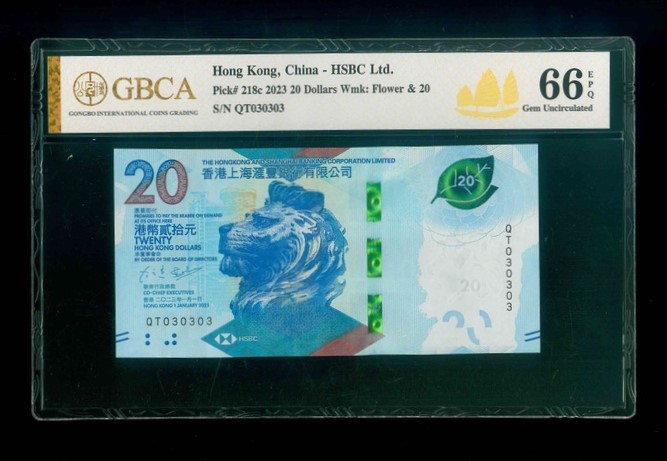 2023 香港上海滙豐銀行 $20 GBCA 66 EPQ 編號:QT030303(重複號,頂級雪白)