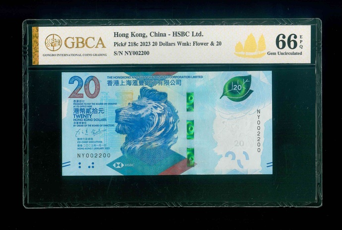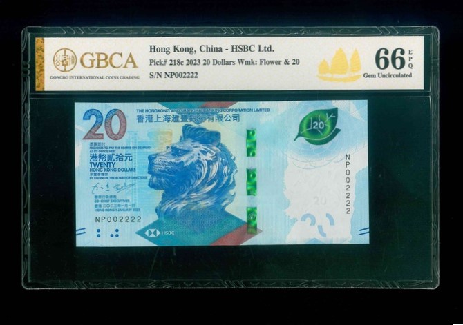 2023 香港上海滙豐銀行 $20 GBCA 66 EPQ 編號:NP002222(獅子號,頂級雪白)