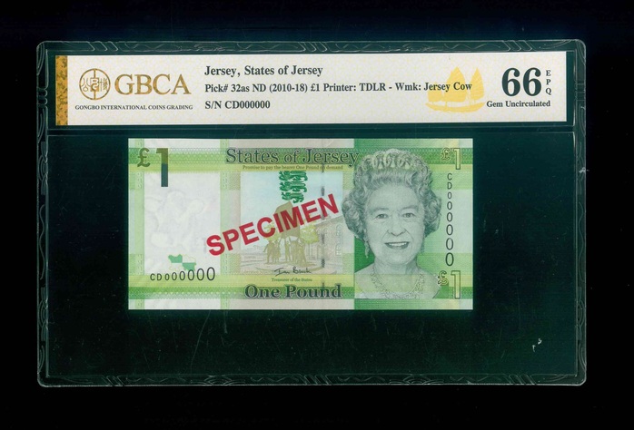 2010-18ND 澤西島 £1 GBCA 66 EPQ 編號:CD000000(樣鈔,頂級雪白)