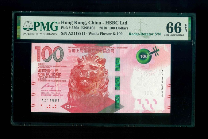 2018 香港上海滙豐銀行 $100 PMG 66 EPQ 編號:AZ118811(雷達/旋轉/三對子,頂級雪白)