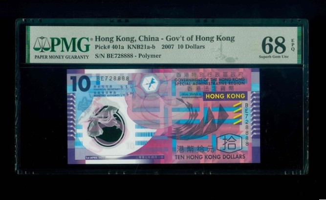 2007 香港特區政府 $10 PMG 68 EPQ 編號:BE728888(獅子號,頂級雪白)