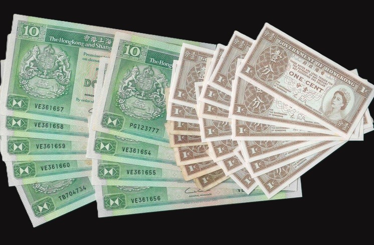 1992 香港上海滙豐 $10x9/ 香港政府壹分x20 VF-UNC 編號:PG123777…(共19張,含豹子/連號)