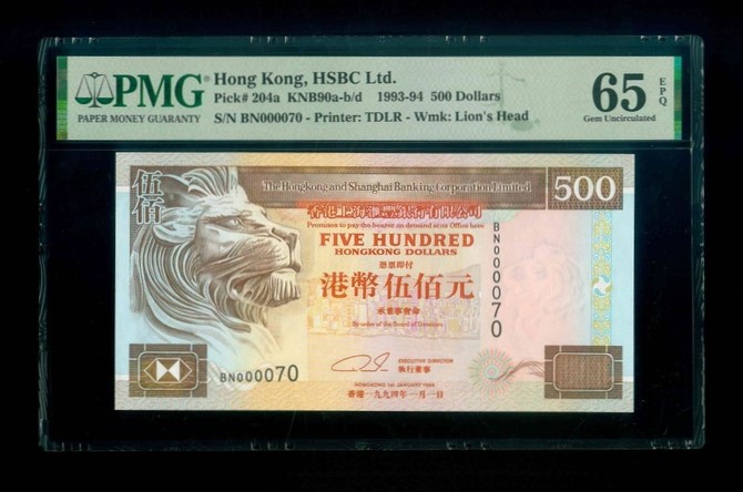 1994 香港上海滙豐銀行 $500 PMG 65 EPQ 編號:BN000070(70號)