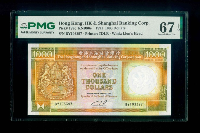 1991 香港上海滙豐銀行 $1000 PMG 67 EPQ 編號:BY103397