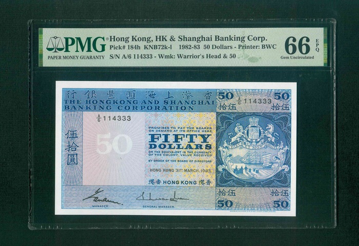 1983 香港上海滙豐銀行 $50 PMG 66 EPQ 編號:A/6 114333(豹子號,頂級雪白)