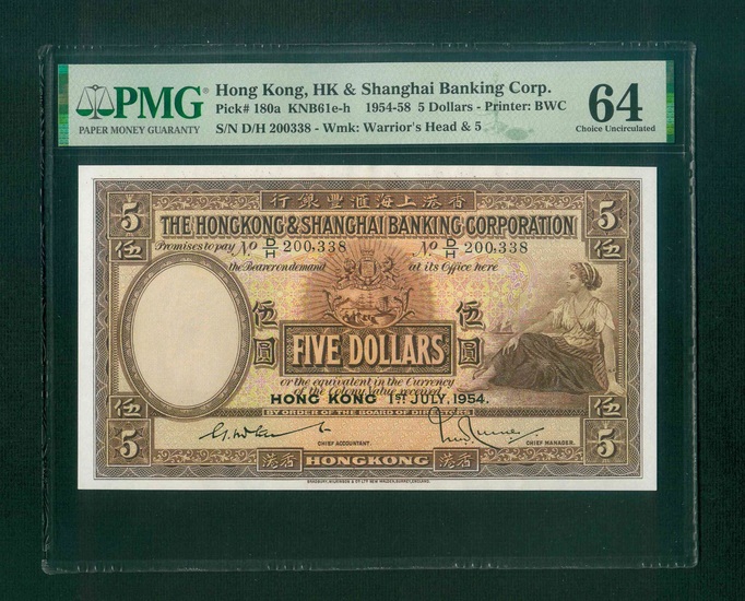 1954 香港上海滙豐銀行 $5 PMG 64 編號:D/H 200338