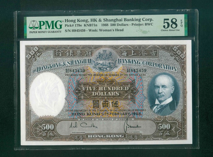 1968 香港上海滙豐銀行 $500 PMG 58 EPQ 編號:H845459