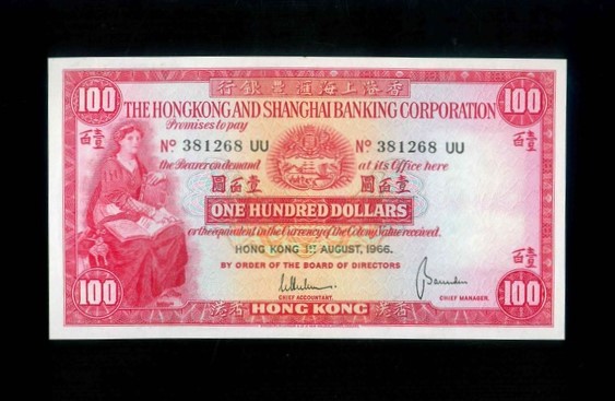 1966 香港上海滙豐銀行 $100 VF 編號:381268 UU