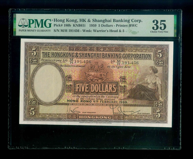 1959 香港上海滙豐銀行 $5 PMG 35 編號:M/H 191456