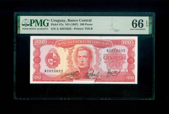1967ND Uruguay(烏拉圭) 100 Pesos PMG 66 EPQ 編號:42075622