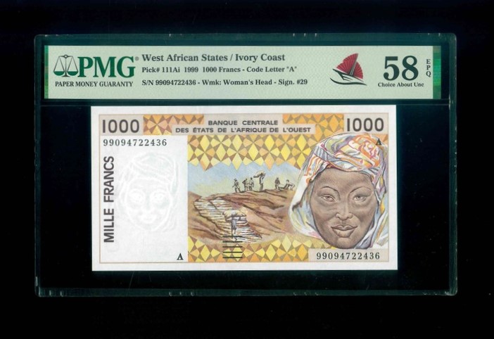 1999 西非/科特迪瓦 1000 Francs PMG 58 EPQ 編號:99094722436