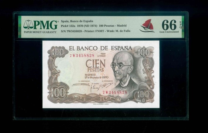 1970 西班牙 100 Pesetas PMG 66 EPQ 編號:7W 3458828