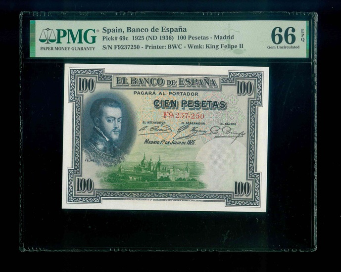 1925 西班牙 100 Pesetas PMG 66 EPQ 編號:7W F9237250