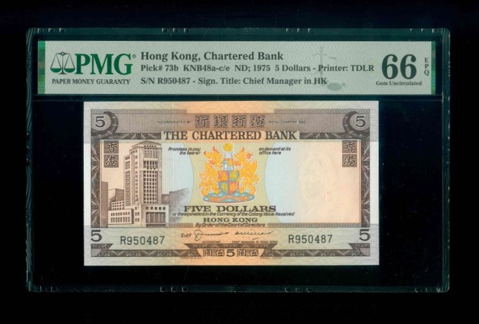 1975ND 香港渣打銀行 $5 PMG 66 EPQ 編號:R950487(頂級雪白)