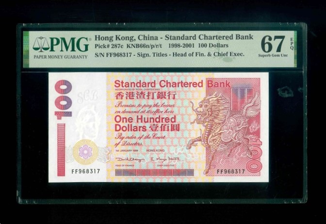 1999 香港渣打銀行 $100 PMG 67 EPQ 編號:FF968317(頂級雪白)