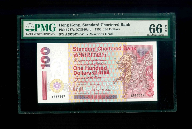 1993 香港渣打銀行 $100 PMG 66 EPQ 編號:A587367