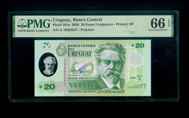 2020 Uruguay(烏拉圭) 20 Pesos PMG 66 EPQ 編號:19485077(頂級雪白)