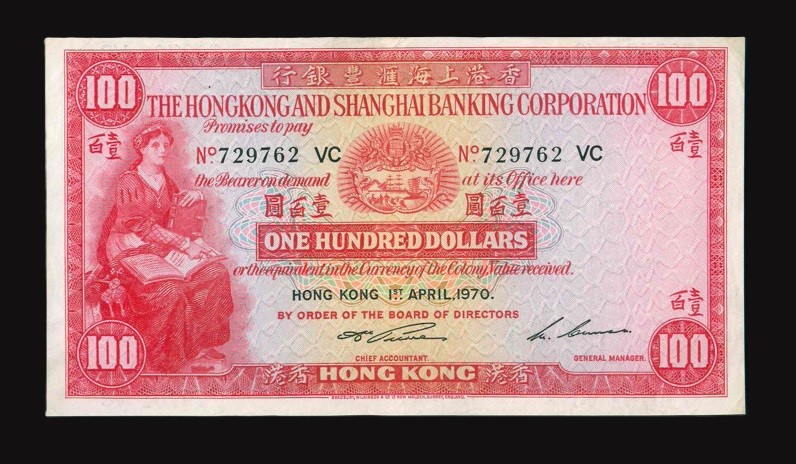 1970 香港上海匯豐銀行$100 VF 編號: 729762VC
