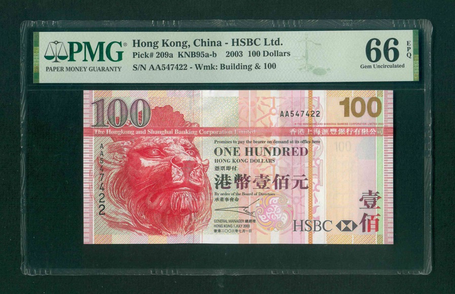 2003 香港上海匯豐銀行$100 PMG 66 EPQ 編號: AA547422(頭版系列,頂級雪白)