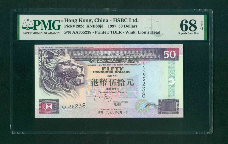 1997 香港上海匯豐銀行$50 PMG 68 EPQ 編號: AA355238(高分頭版,頂級雪白)